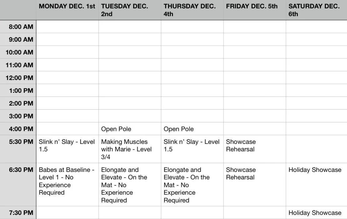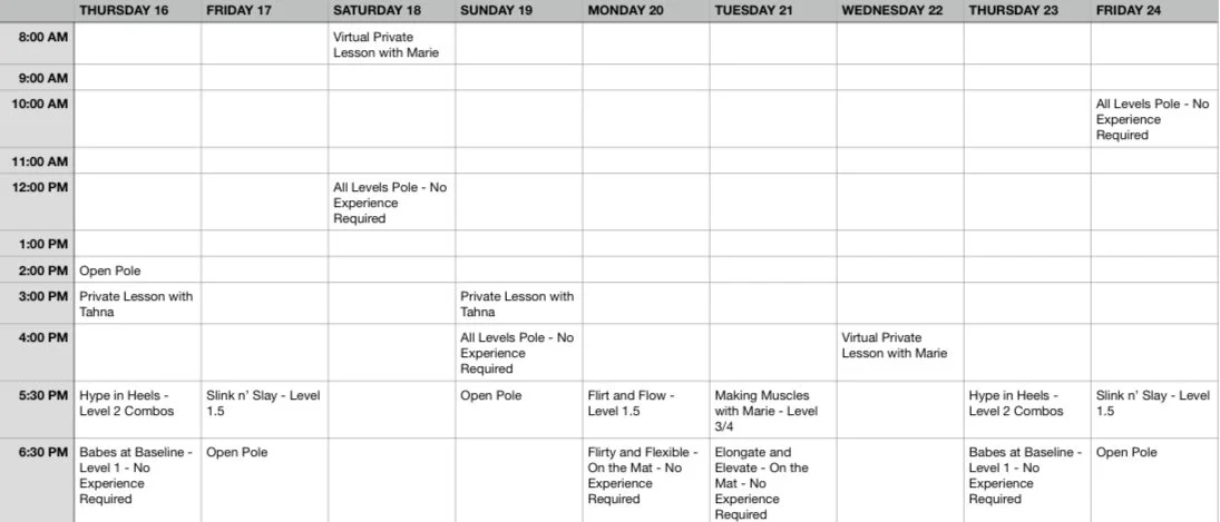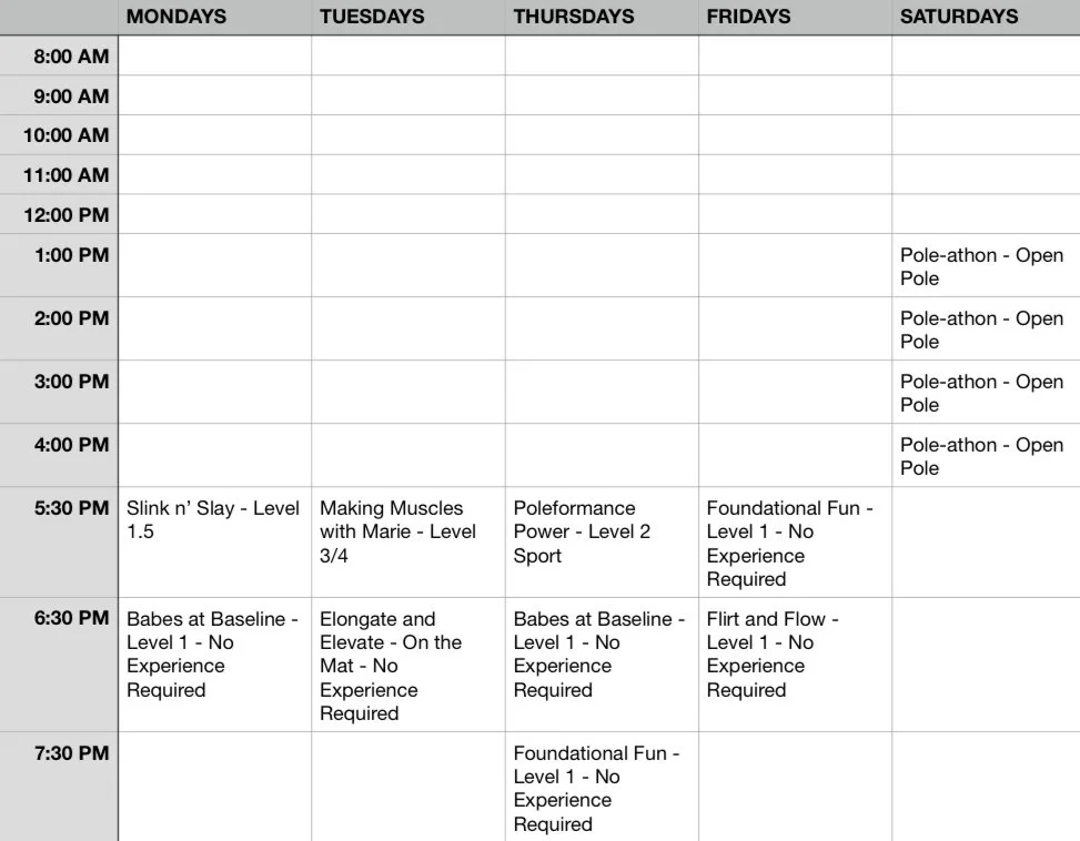 For pole classes, please skip lotions on the day of class and wear a tank top and shorts or swimsuit. More exposed skin=better grip on the pole.