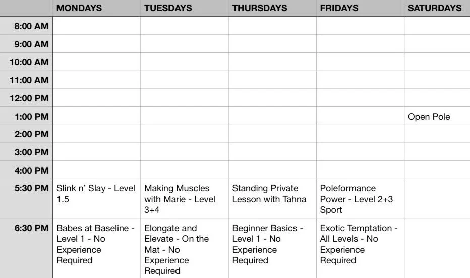 For pole classes, please skip lotions on the day of class and wear a tank top and shorts or swimsuit. More exposed skin=better grip on the pole. Also, please remove jewelry.